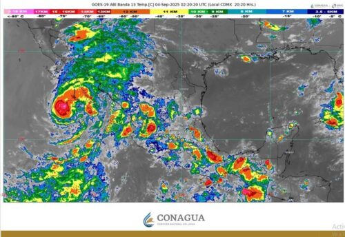 El Servicio Meteorológico Nacional (SMN), de la Comisión Nacional del Agua (Conagua), en coordinación con el Centro Nacional de Huracanes, de Estados Unidos de América, mantiene una zona de prevención por efecto de vientos de tormenta tropical desde Santa Fe hasta Punta Eugenia, zona de vigilancia por efecto de vientos de tormenta tropical desde Todos Santos hasta Santa Fe, en Baja California Sur, y desde Santa Rosalía hasta Bahía de los Ángeles, en Baja California.