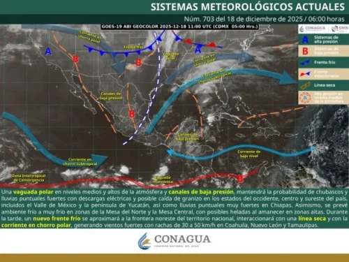 Monserrat Hernández / Este día, una vaguada polar en niveles medios y altos de la atmósfera y canales de baja presión en el interior del territorio nacional, mantendrán la probabilidad de chubascos y lluvias puntuales fuertes con descargas eléctricas y posible caída de granizo en los estados del occidente, centro y sureste del país, incluidos el Valle de México y la península de Yucatán, así como lluvias puntuales muy fuertes en Chiapas. Asimismo, se prevé ambiente frío a muy frío en zonas de la Mesa del Norte y la Mesa Central, con posibles heladas al amanecer en zonas altas. Durante la tarde, un nuevo frente frío se aproximará a la frontera noreste del territorio nacional, interaccionará con una línea seca y con la corriente en chorro polar, generando vientos fuertes con rachas de 30 a 50 km/h en Coahuila, Nuevo León y Tamaulipas.