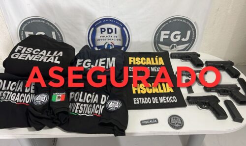 Una vez que logran su detención, y al revisar la unidad en que viajaban, les fueron aseguradas además tres armas de fuego, dos réplicas de armas de fuego, así como vestimenta con colores, escudos y leyendas simulando ser las empleadas por elementos de esta Fiscalía.