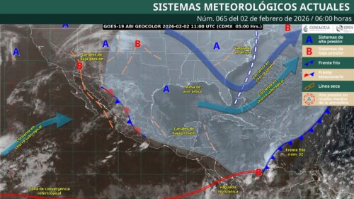 Coneme / Este día, el frente frío núm. 40 se desplazará sobre el oriente y sureste del país, incluida la península de Yucatán, ocasionando chubascos y lluvias puntuales fuertes en dichas regiones; lluvias muy fuertes en Campeche y Quintana Roo; y lluvias intensas en Veracruz (sur), Oaxaca (noreste), Chiapas (noroeste y norte) y Tabasco (sur y oeste). Así mismo, la masa de aire polar provocará un descenso de temperatura en los estados de la Mesa del Norte, Mesa Central, oriente y sureste del territorio nacional; evento de “Norte” de muy fuerte a intenso y oleaje elevado en el litoral de Tamaulipas, Veracruz, Tabasco, Campeche, Yucatán y Quintana Roo, además del istmo y golfo de Tehuantepec.