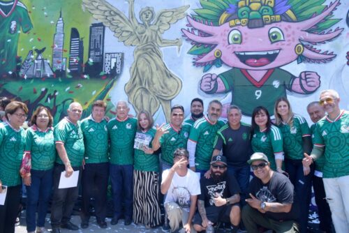 Coneme / El diputado Israel Moreno Rivera y sus compañeros del Congreso de la Ciudad de México, así como el ex futbolista Manuel Negrete develaron el día de hoy un enorme mural de 13 metros por 6 metros del Mundial de Futbol 2026.